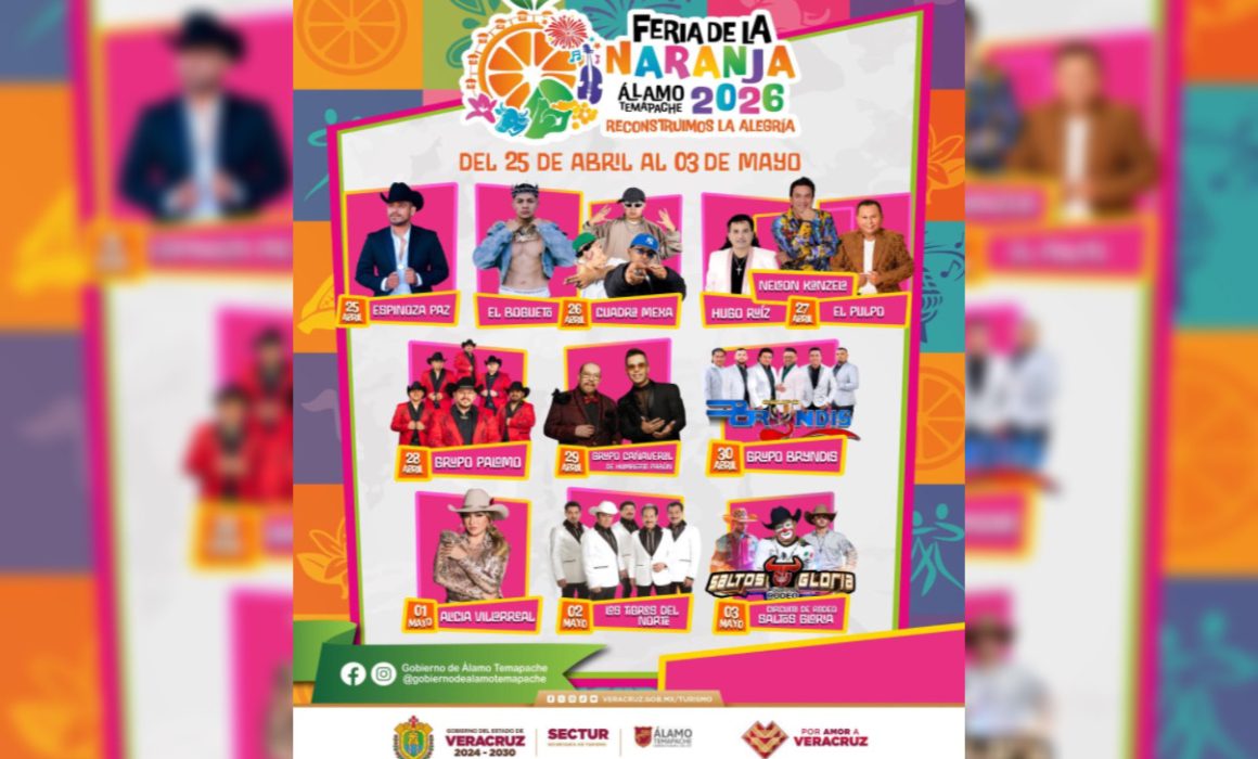 Álamo Temapache, Ver., 22 de abril de 2026.– A partir de este sábado, el municipio de Álamo Temapache será sede de la tradicional Feria de la Naranja 2026, una de las celebraciones más representativas del norte del estado que destaca la riqueza citrícola, cultural y turística de la región. Una fiesta con identidad y tradición Este evento rinde homenaje a la producción de naranja, actividad que posiciona a Álamo como uno de los principales municipios citrícolas del país, además de fortalecer el orgullo y la identidad huasteca. La feria también…