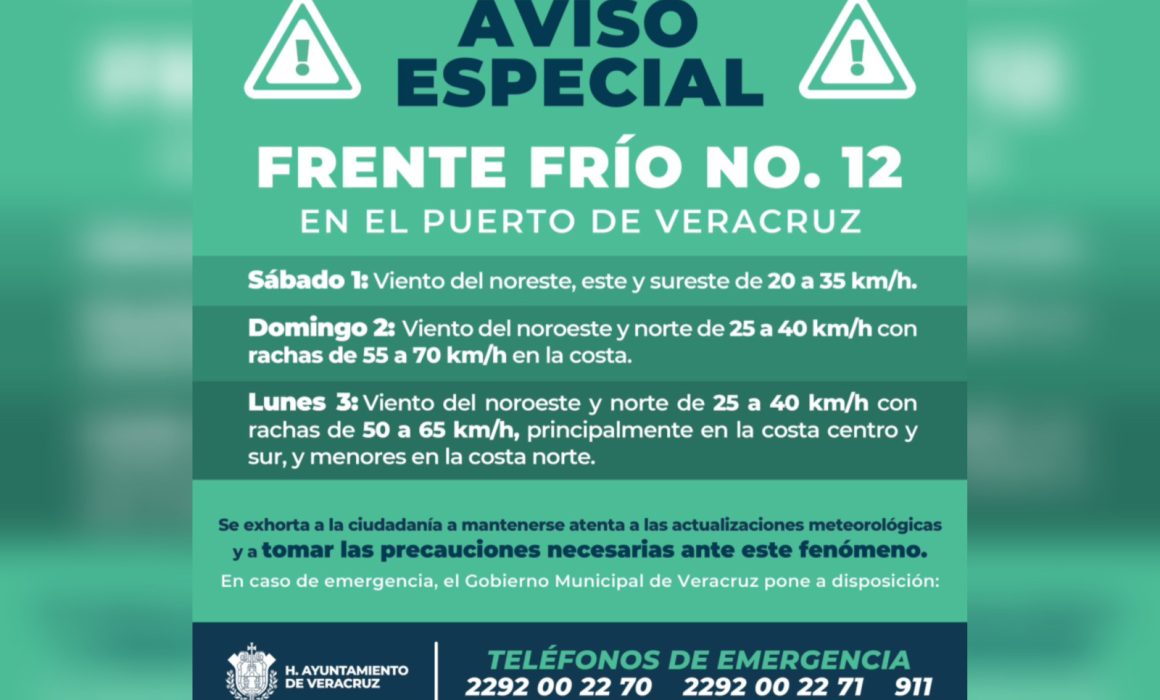 Veracruz, Ver. – 31 de octubre de 2025. — El Gobierno Municipal de Veracruz, a través de la Unidad de Protección Civil, emitió un Aviso Especial ante la entrada del Frente Frío número 12, previsto para los días domingo 2 y lunes 3 de noviembre, el cual traerá lluvias, viento fuerte y descenso de temperatura en la zona costera.